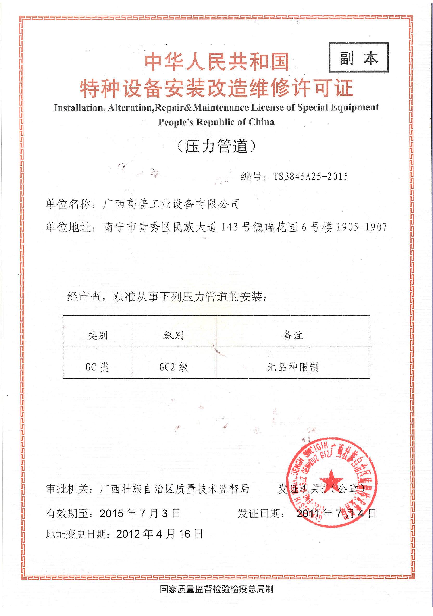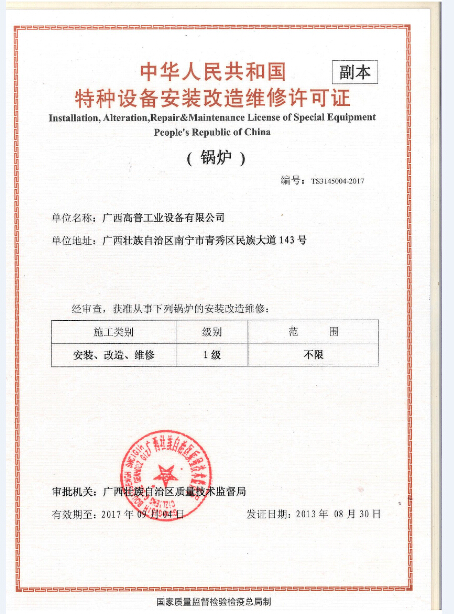 本公司是高新技術企業,持有國家技術監督局頒發的1級《特種設備安裝、改造、維修(鍋爐)》許可證,1級許可證是最高級別,可安裝、改造、維修任何形式、參數的鍋爐設備。并持有《壓力管道》安裝、改造維修許可證,1級《壓力容器》安裝、改造、維修,機電設備安裝工程專業承包3級等資質。